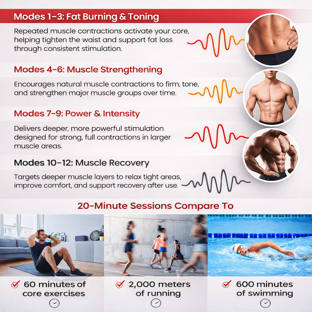 The Ultra Stimulator solves this by sending precise electrical pulses that engage 90% of your muscle fibers including the deep layers traditional exercise can't reach without technology.