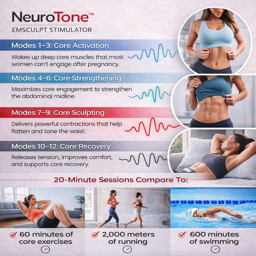 NeuroTone™ uses advanced neuromuscular stimulation (EMS). Unlike traditional exercises that activate only 20–30% of muscle fibers, EMS can stimulate up to 90% by directly activating motor neurons — triggering deep, controlled contractions in muscles that are difficult to engage after pregnancy and helping restore core engagement over time.